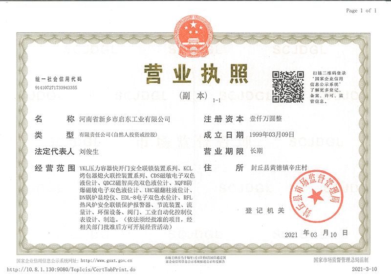 河南省新鄉(xiāng)市啟東工業(yè)有限公司始建于1987年,是專注研發(fā)、生產(chǎn)自動化儀器儀表(主要與壓力容器、鍋爐等容器配套使用)的廠家。主要產(chǎn)品有液位計(磁敏雙色型、磁翻柱型等)系列、烤包器熄火聯(lián)控裝置系列、壓力容器快開門安全聯(lián)鎖保護裝置系列、鍋爐報警器系列。二十多年來,公司產(chǎn)品暢銷國內(nèi)并遠銷俄羅斯、蒙古與東南亞,深得廣大用戶的信賴和好評。我們多年來致力于自動化儀器儀表的研制生產(chǎn),公司現(xiàn)具有完善的生產(chǎn)、試驗、檢測手段和設備。科技創(chuàng)新、誠信服務,是我們不變的經(jīng)營理念,我們將以強有力的技術支持及售后竭誠為客戶提供良好的服務?! ?012年我公司成功研發(fā)了KCL系列烤包器熄火聯(lián)控裝置,并于2013年2月2日榮獲中華人民共和國國家知識產(chǎn)權局辦法的《實用新型**證書》<**號:2021202257735>該產(chǎn)品廣泛應用于唐鋼等大型鋼鐵企業(yè),為烤包器安全作業(yè)提供了有力的保障?! ?002年我公司成功研發(fā)磁敏電子雙色液位計獨特的高亮度LED紅綠雙色顯示,獲得了專家的首肯和用戶的一致好評。在此基礎上我公司研發(fā)人員十年磨一劍,致力于XQFB-1防爆型磁敏雙色液位計的研發(fā),于2013年12月27日由國家防爆電器產(chǎn)品質(zhì)量監(jiān)督檢驗中心檢驗合格并頒發(fā)防爆合格證書<編號:cnex19.0883>。該產(chǎn)品性能得到了充分的發(fā)揮,廣泛應用于含有Ⅱ類A·B級T1-T4組可燃氣體或蒸汽與空氣混合形成的爆炸性混合物的0區(qū)、1區(qū)危險場所。連接用戶DCS或PLC系統(tǒng)實現(xiàn)遠距離集中顯示和控制,從而實現(xiàn)節(jié)能、數(shù)字化管理。為用戶增加了一定的經(jīng)濟效益和社會效益,。2014年公司成功申請了夢潤儀表的logo,新的品牌新的形象,夢潤儀表是啟東的LOGO, 歡迎新老用戶前來洽談合作。  我們一如既往地注重科研的投入,憑借產(chǎn)品的不斷更新、加大科技含量,進一步拓展市場。我們相信品質(zhì)成就未來,以過硬質(zhì)量、優(yōu)惠價格、完善的售后服務熱忱歡迎廣大客戶來我司視察指導、洽談業(yè)務;精誠合作,共創(chuàng)輝煌!